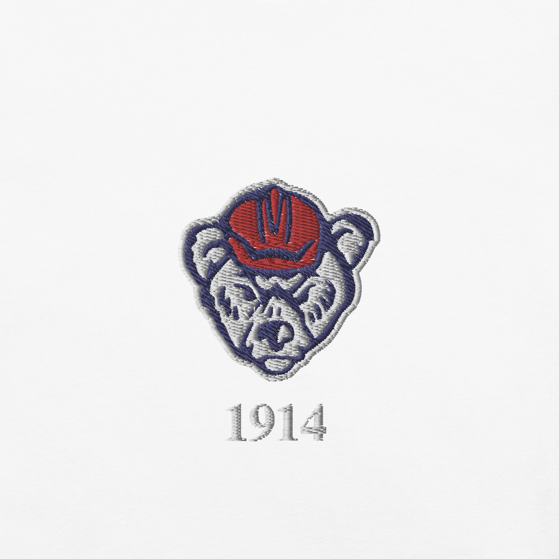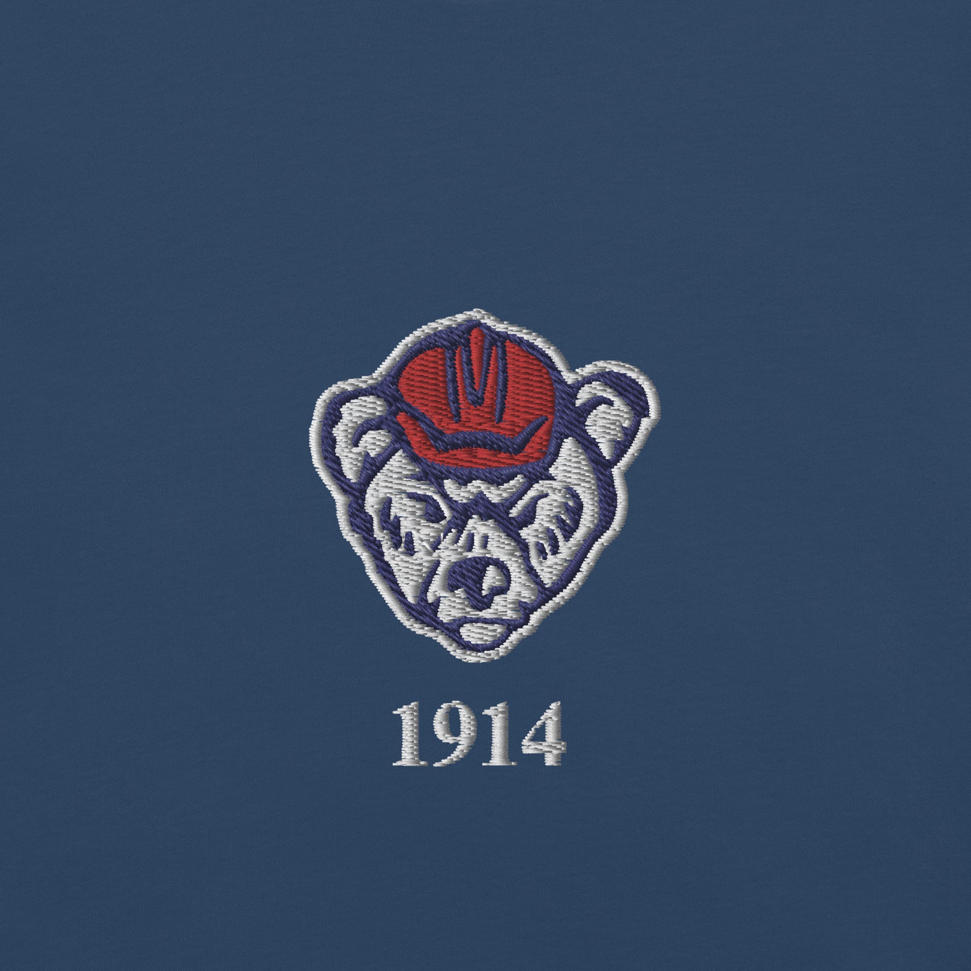 our bear in a red hard hat, stitched with 1914 below—worn as a quiet nod to the foundation this fanbase was built on.