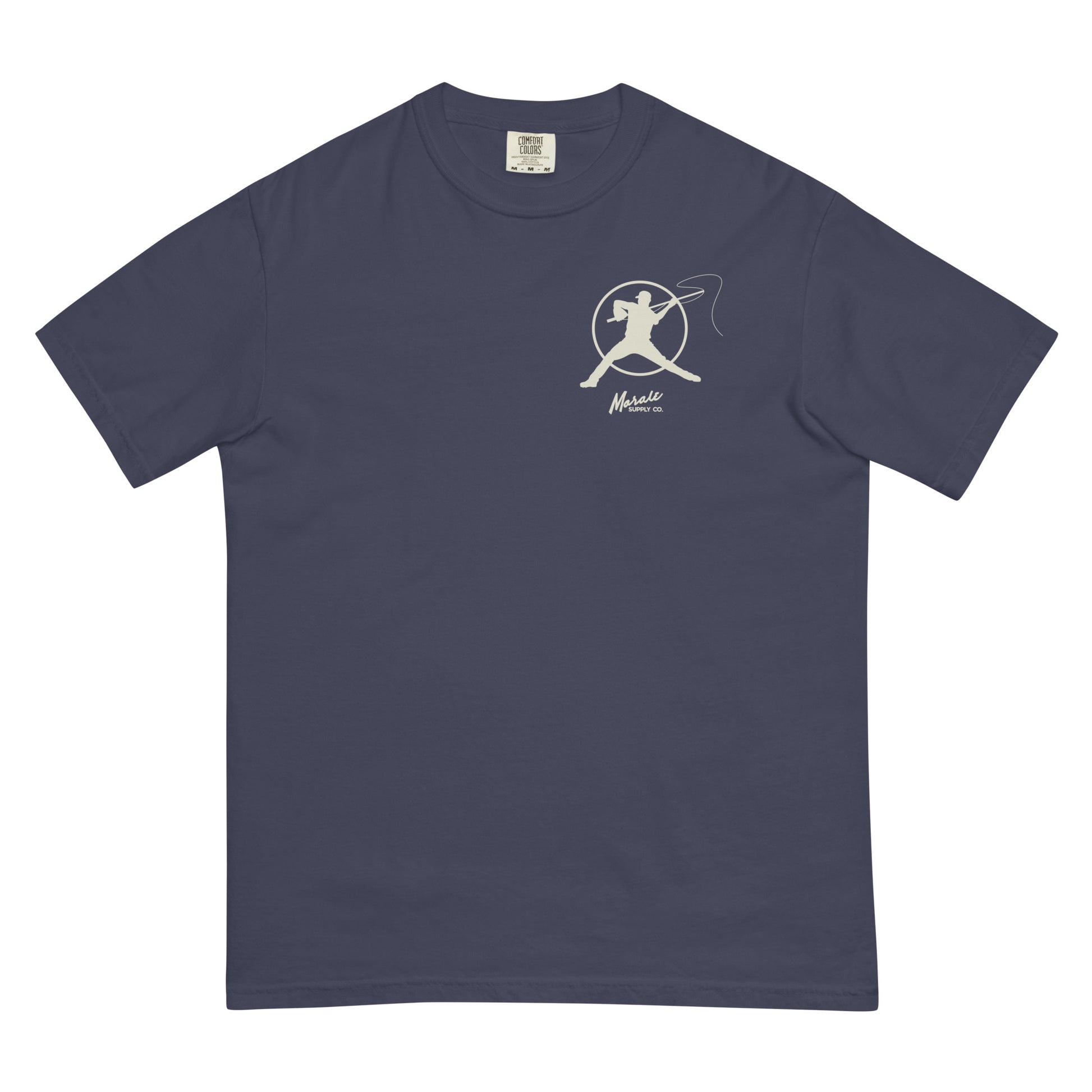 back graphic framed like a postcard, front chest hit with the silhouette and lasso.